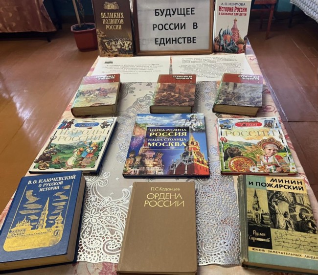 В Каморинской сельской библиотеке проведён обзор книжной выставки «Будущее России в единстве». На выставке представлены книги, посвящённые истории нашей страны событиям 1612 года, когда воины народного ополчения под предводительством Минина и Пожарского освободили Москву от польских интервентов, проевив героизм, беззаветную преданность Родине и сплоченность.